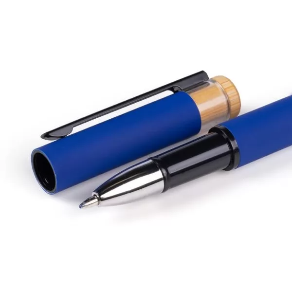 Caneta azul em Alumínio reciclado / Bambu com tampa. Conta com carga roller azul.